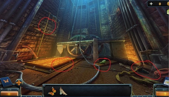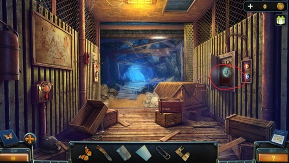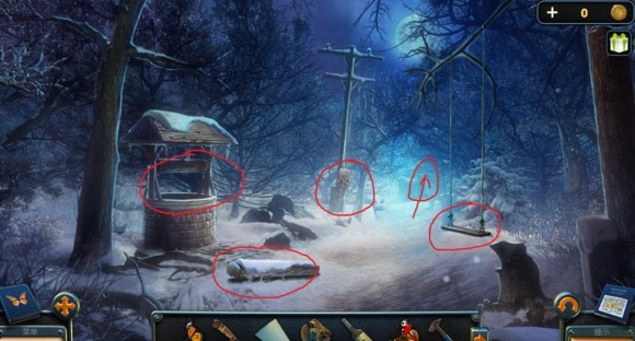47、进木屋。室内太黑要灯光。地上捡钩绳。返回秋千场景,用钩绳钩起井里的箱子,得到闸刀开关,铁箱锁差部件。电线杆上安闸刀开关,灯亮了,回小木屋。