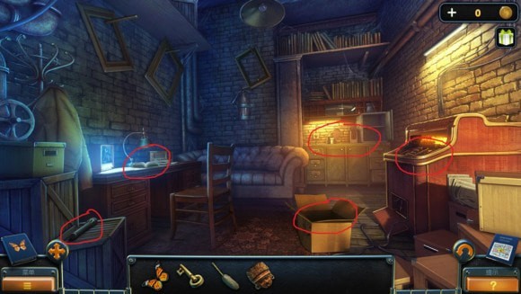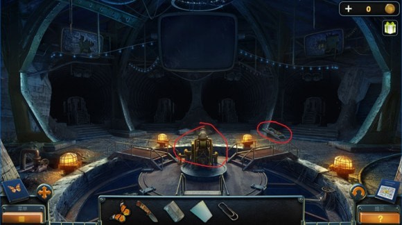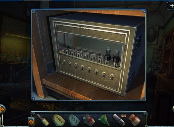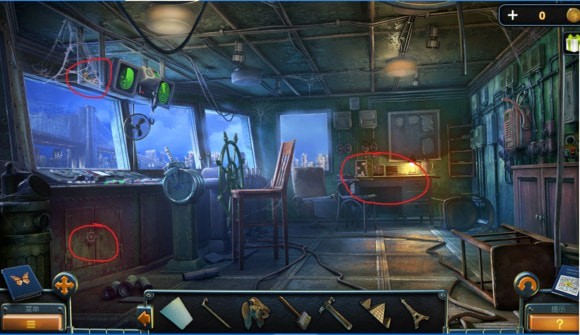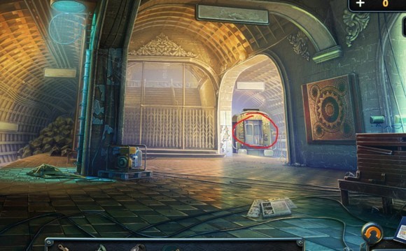 4、支警卫室与保安交谈,捡左下侧木箱上的电筒,发现需要电池,捡刀片;查看书桌,得到关警报器的密码15082,记下,找到报纸下盖住的钥匙,看一下旁边的报纸 ,得知最近有人频繁失踪;用刀片划开地上的纸箱,得到毛刷;点工作台,玩小游戏,得到面具;调查右侧的控制台,发现少一个灯泡。