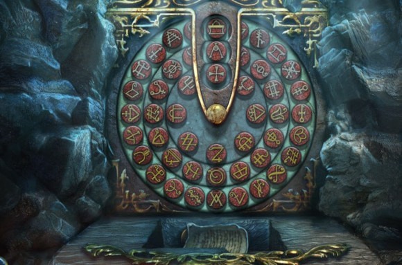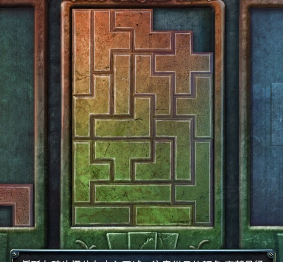 55、往前走,地下大厅,点洞,进去,按提示转动石头,调整图案,得锁片。
