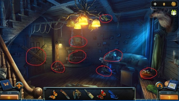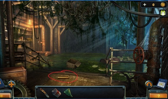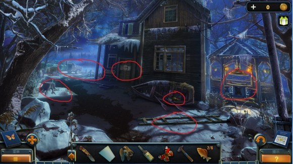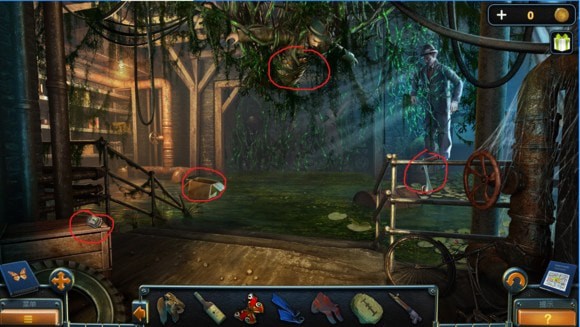 45、点树桩,斧头差柄,地上梯子差几块阶梯;点小屋门,要鱼形木块;小船上有氧瓶,提示可以拆零件但缺工具;小凉亭,玩小游戏。得修煎刀。返回秋千场景,剪电线杆枯枝,得鱼形,电闸差一个开关。