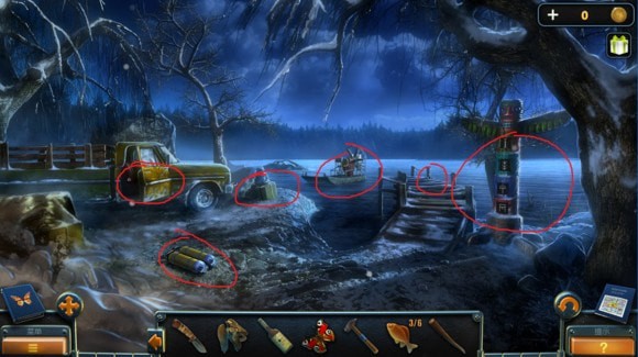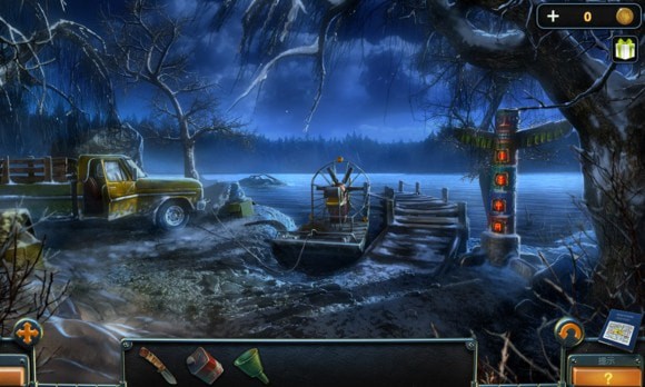 46、捡木棍,查看氧气瓶可以拆零件差工具;点汽车门,捡鱼形块;点车头,刀割开纸箱,得钉子;提示可以拉动渡船,把汽车前的挂钩甩到渡船上挂住;点湖边栈道,得小铲子;看雕像,差四个模块。回小木屋场景。