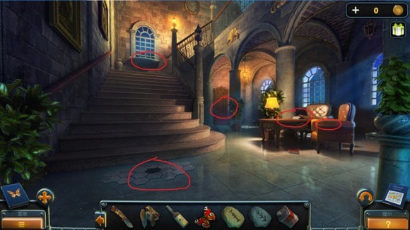 66、一楼小房间,手电筒照墙壁上的洞,再用槌子砸得蝴蝶;雕像上安大奖章,得蝴蝶。